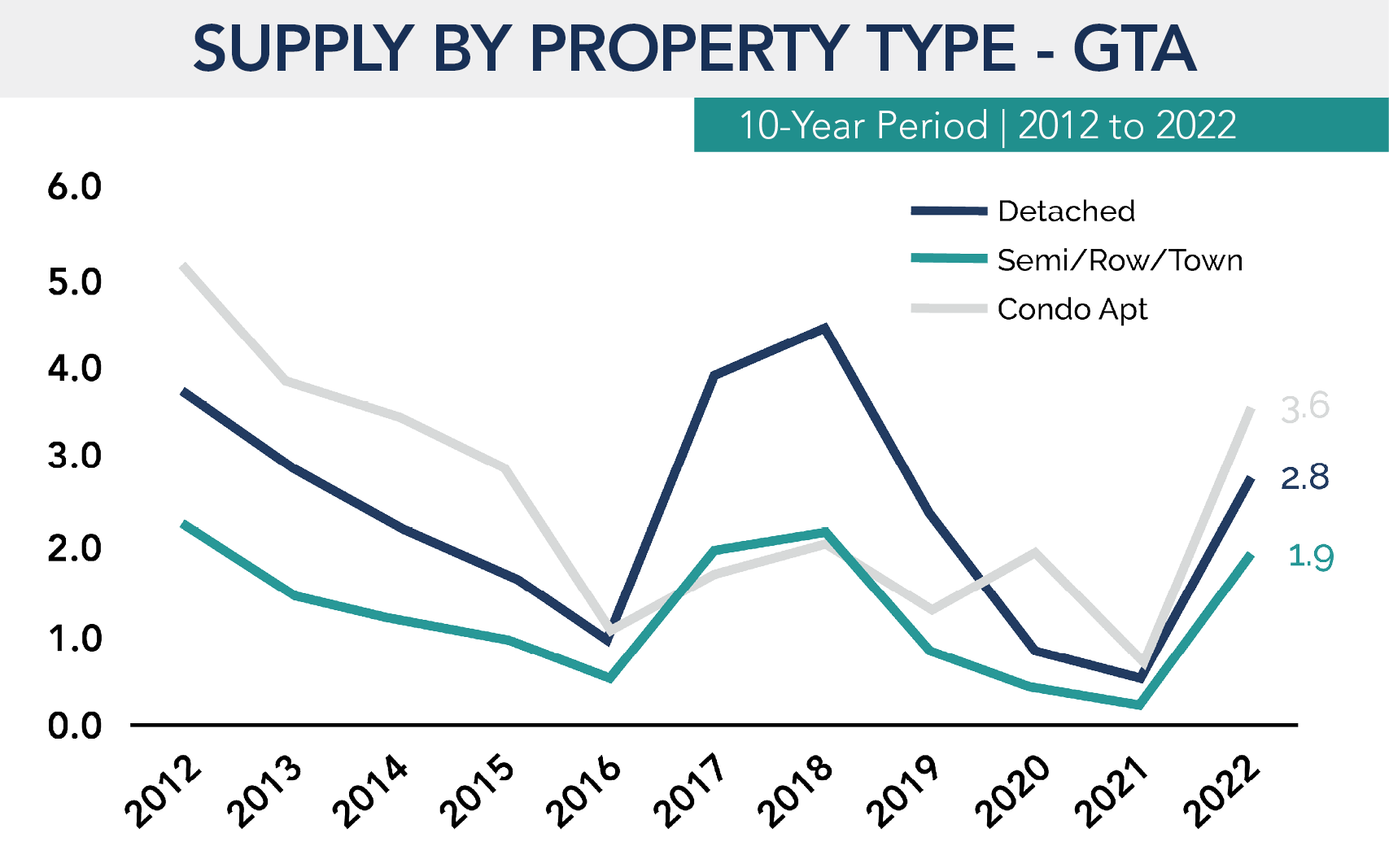 2022 was an adjustment year for the GTA housing market, which occurred following overheated market conditions in 2021 and aggressive interest rate increases by the Bank of Canada to combat quickly rising inflation.